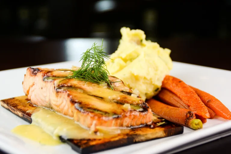 Grilled 8oz salmon fillet topped with dill sour cream and lemon