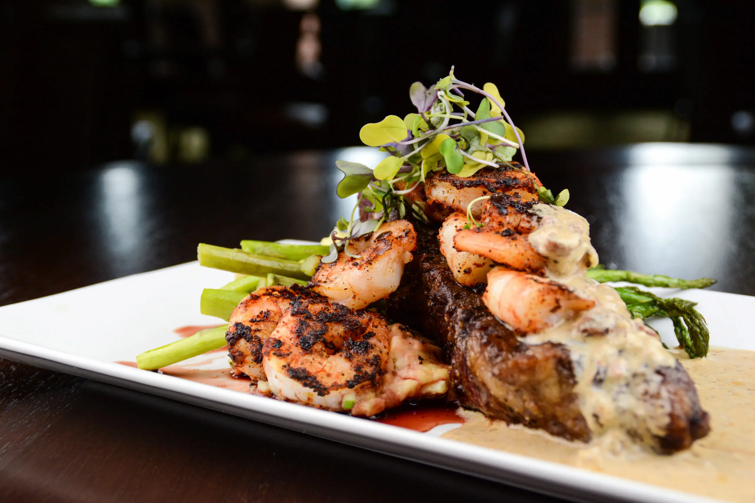 Pan-seared mahi topped with saffron beurre blanc served with roasted lemon asparagus and pecorino risotto