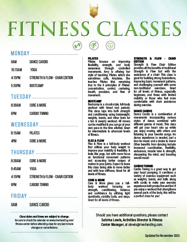 For questions, contact Fitness Center Manager and Activities Director, Sabrina Lewis.