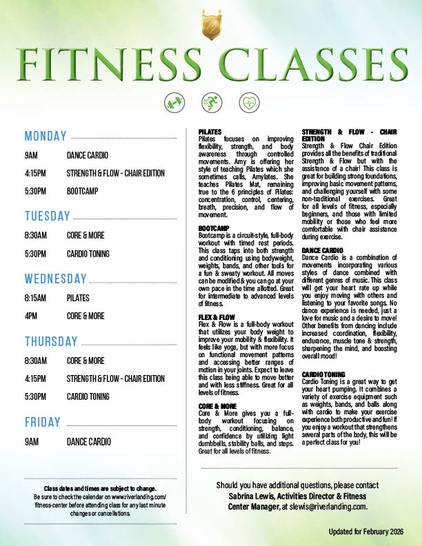 For questions, contact Fitness Center Manager and Activities Director, Sabrina Lewis.