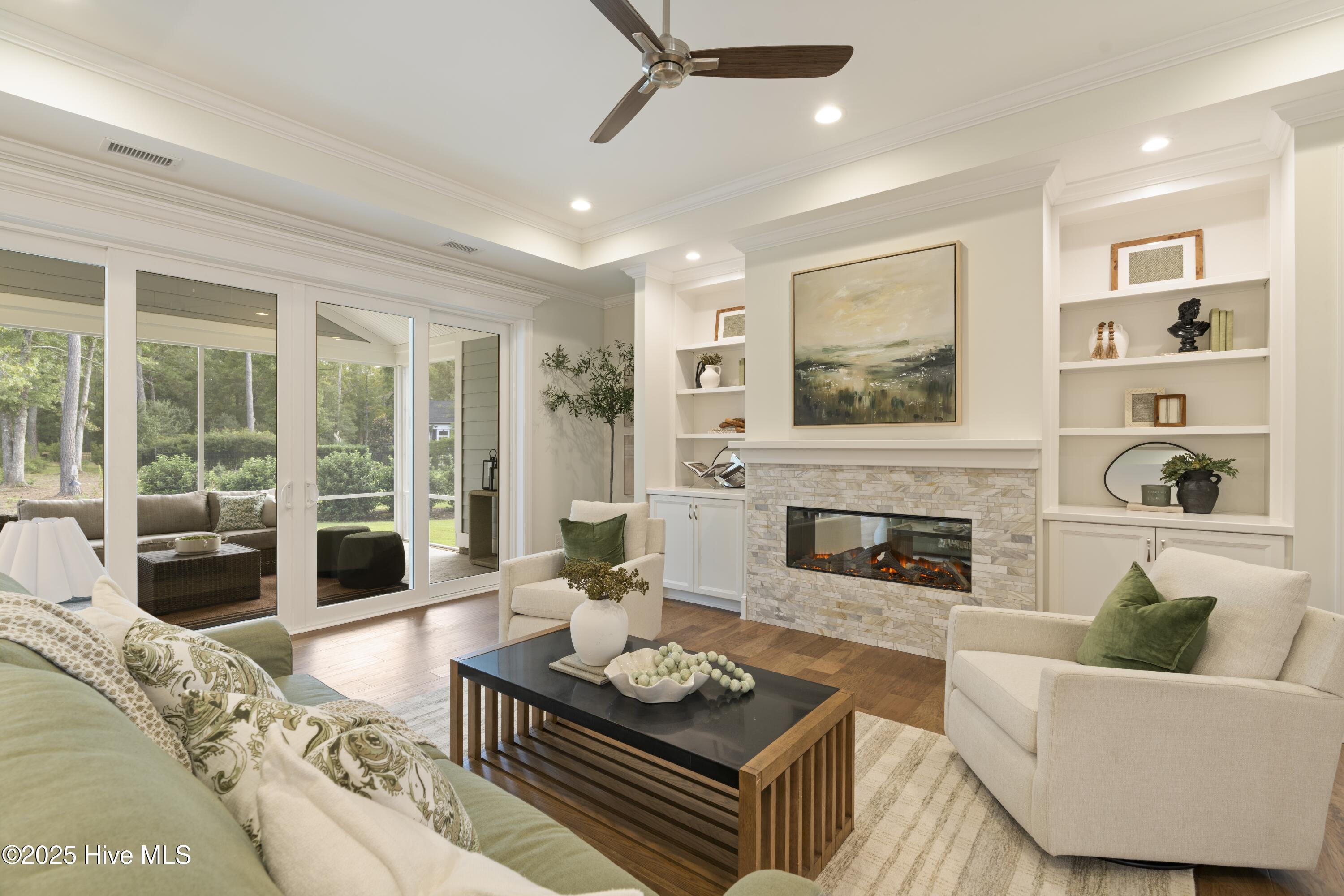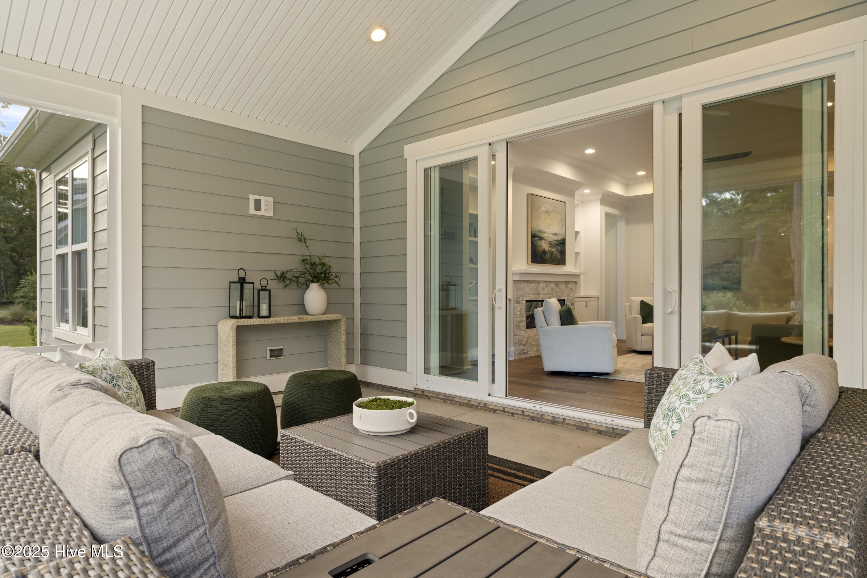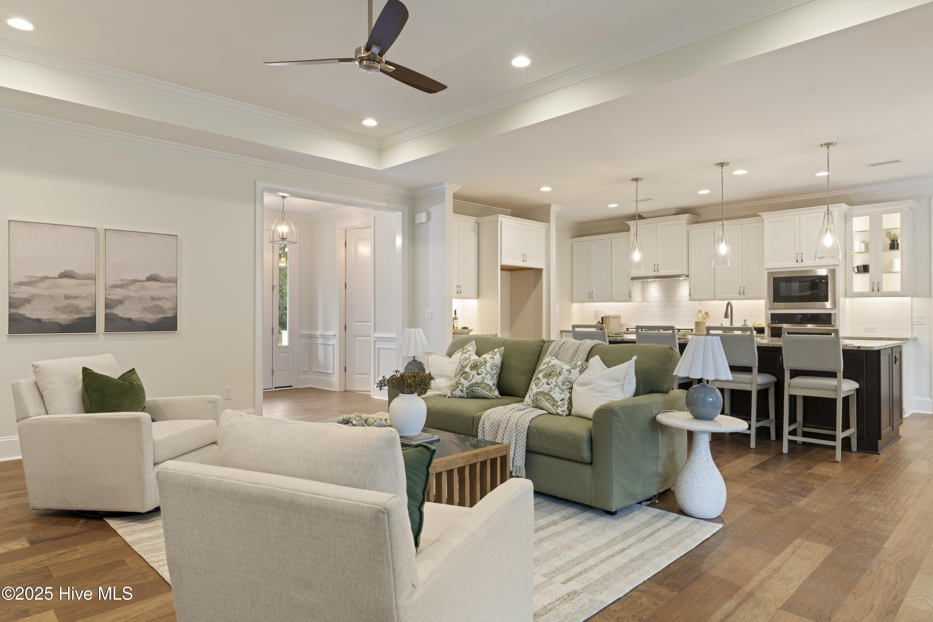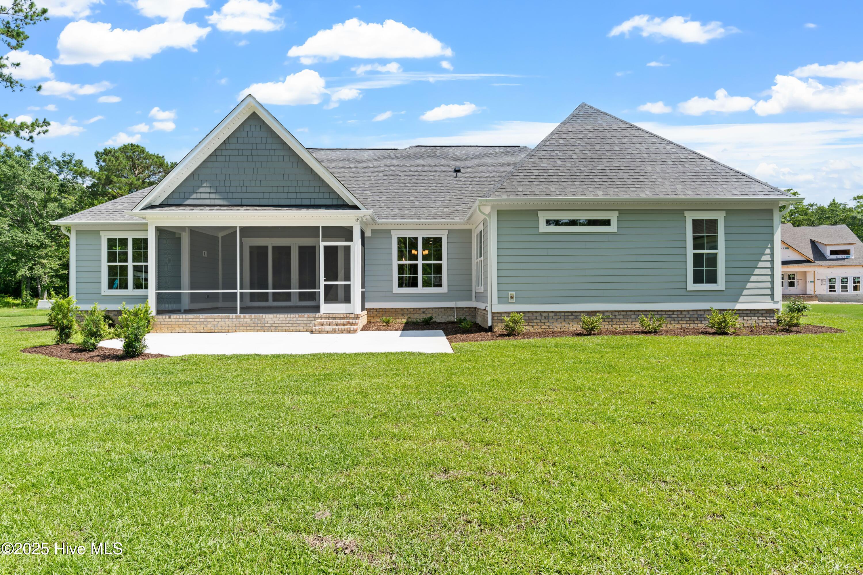 Welcome to the Turtle Cove Plan by Horizon Homes of Wilmington- Where Style Meets Functionality. This thoughtfully designed 3-bedroom, 3.5-bath home features a desirable split-bedroom layout with a first-floor study and a serene screened-in covered back porch. The open-concept living space is anchored by a chef-inspired kitchen complete with a gas range, vented hood, wall-mounted oven, built-in microwave, and a spacious island offering cabinetry on both sides for maximum storage. The owner's suite boasts a luxurious zero-entry tiled shower, while 9' ceilings, crown molding throughout, a cozy fireplace, 7¼'' baseboards, and durable LVT/LVP flooring add elegance and comfort throughout the home. Upstairs, a generous retreat with a full bath provides a perfect guest suite or second living space. Energy efficiency and smart technology are built-in, including radiant barrier roof decking, Low-E windows and doors, a 15 SEER HVAC system, and WiFi-programmable thermostats. The oversized finished garage is fully insulated and features a belt-driven insulated garage door for added convenience. Located in River Landing, residents enjoy resort-style amenities including two 18 hole championship golf courses, clubhouse, pool, fitness center, pickleball courts and more. All just 40 minutes from historic downtown Wilmington. Photos of home are of similar home for reference only. This is a pre-construction listing showing home plan designed for this lot. Other plans are available from Horizon Homes of Wilmington.