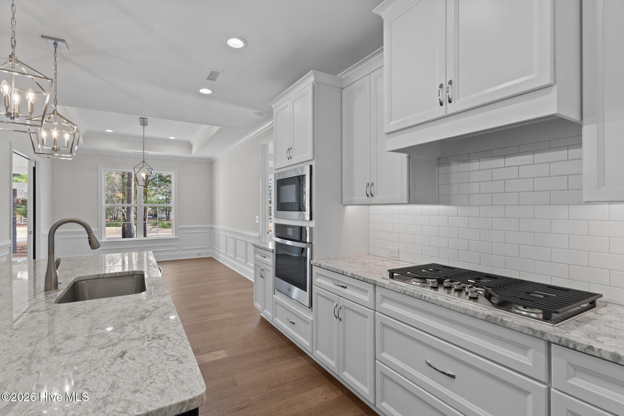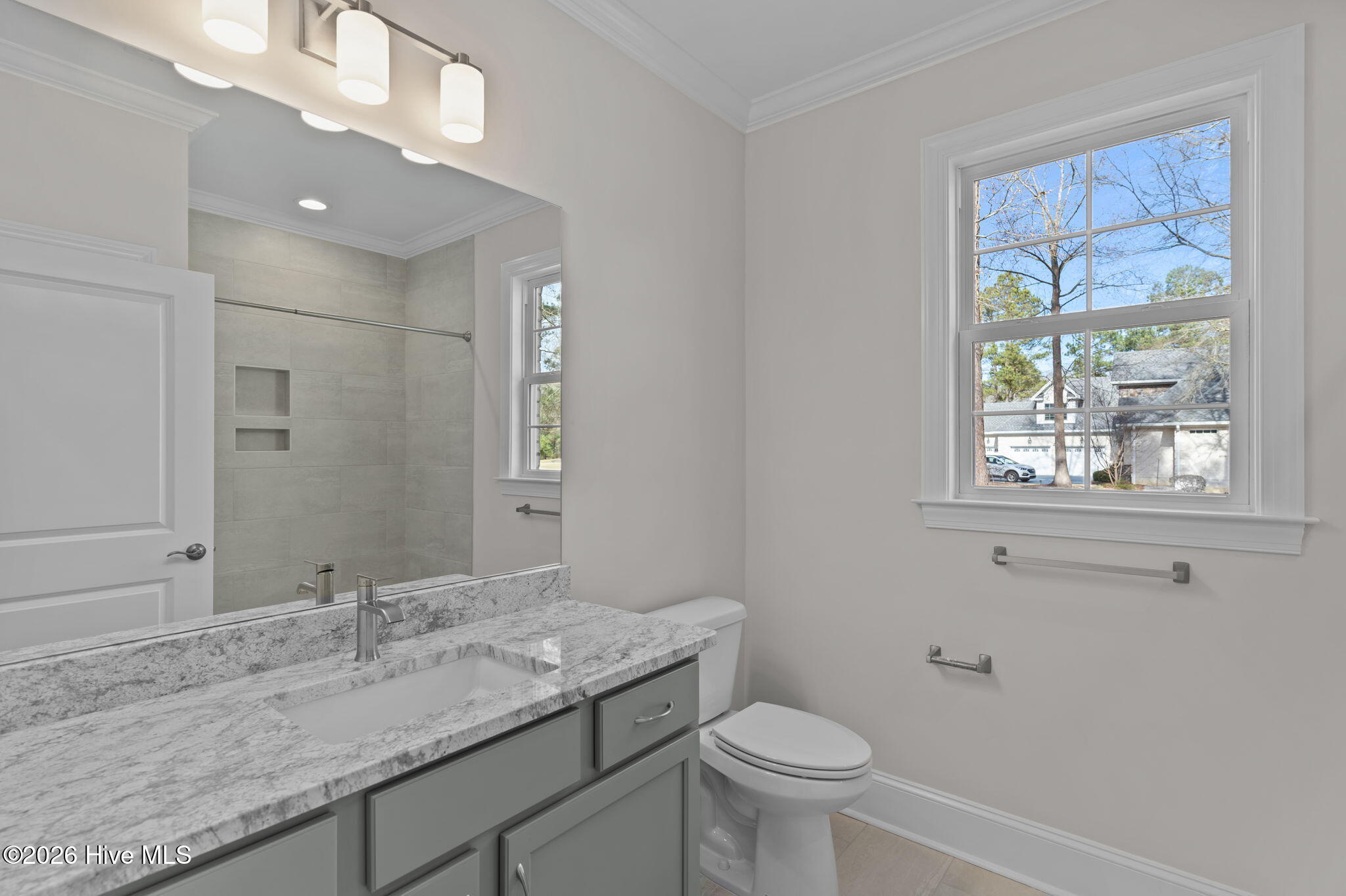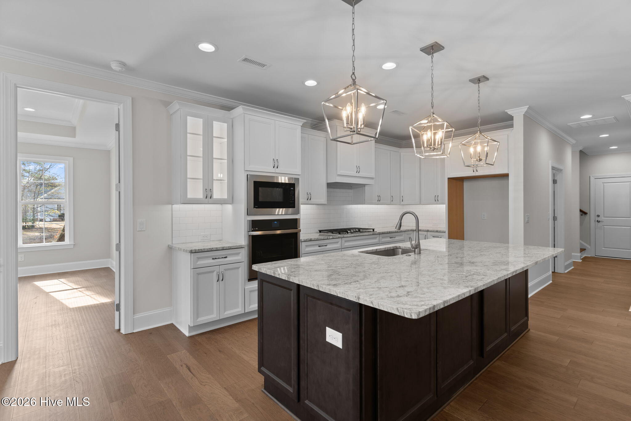 Settle into the ease of coastal living with this thoughtfully designed Coral Bay home by Award Winning Horizon Homes of Wilmington. Created with ''forever home'' living in mind, this 4 bedroom, 3.5 bath residence combines luxury finishes with comfort, accessibility, and low-maintenance convenience. Enjoy peace of mind with maintenance-free brick exterior and long-lasting 50-year shingles--so you can spend more time enjoying life and less time on upkeep. Inside, the open layout is both inviting and functional, centered around a beautifully appointed chef's kitchen complete with gas cooktop. There is abundant storage in the spacious walk-in pantry, and a large granite island perfect for casual dining or entertaining family and friends. The bright Carolina Room, with its wall of windows overlooking the golf course and ponds creates a relaxing space to unwind year-round. Split bedrooms & study all on first floor for easy first floor living. The first floor owner's suite is a private retreat, featuring separate walk-in-closets and its own climate control zone for personalized comfort. The beautiful owners bath has raised height vanities and zero entry tiled shower and access to the laundry area. 9' ceilings, fireplace, crown molding throughout, 7 -1/4'' baseboards, hardwood floors, are just a few of the upgraded features in the home. The Over-sized-finished garage is fully insulated with belt driven, Wifi, insulated garage door with added golf cart door. With emphasis on Smart Home, Energy Efficiency, our homes have radiant barrier roof decking, Low-E windows & doors, & 15 SEER Heating & Air Conditioning with Wifi Programable thermostats. Upstairs, a spacious guest suite with a full bath offers the perfect setup for visiting family or a quiet hobby space. This is more than a home--it's a comfortable, low-maintenance lifestyle designed to support you for years to come, all within one of the area's most desirable golf course community of River Landing. Near the coast of Eastern NC, River Landing is a vibrant community for those who are retired, starting a family, and everyone in between. Complete with world-class Club amenities, two 18-hole championship golf courses, a beautiful Clubhouse, glistening heated outdoor pool, expansive homesites, and scenic walking and biking trails there is something for everyone. Located just 25 minutes from Wilmington and an hour and 20 minutes from Raleigh, you can experience the charm and ease of a small hometown while being a short drive from North Carolina's most beautiful beaches and metropolitan areas. Leaseback opportunity available from builder.