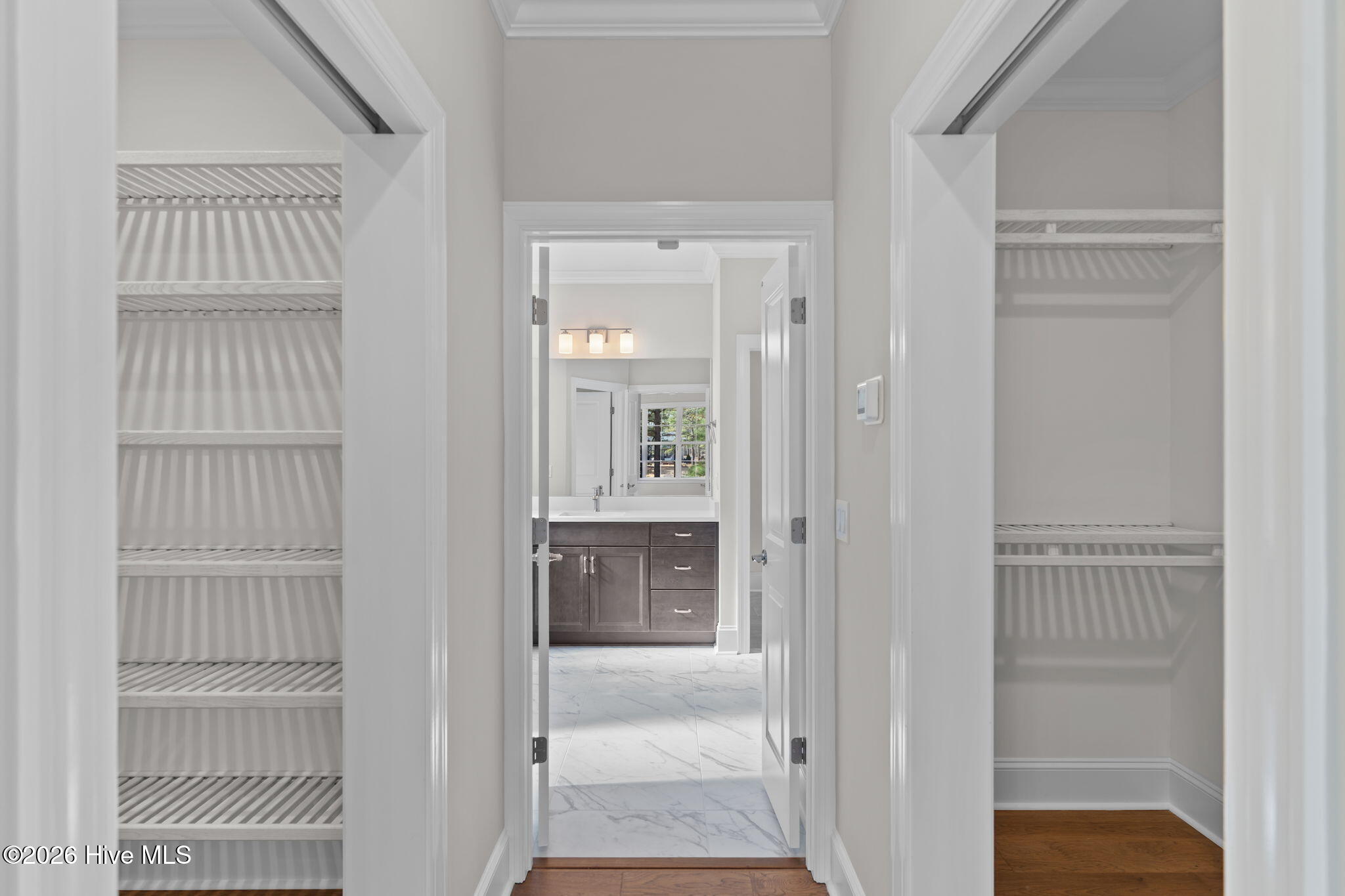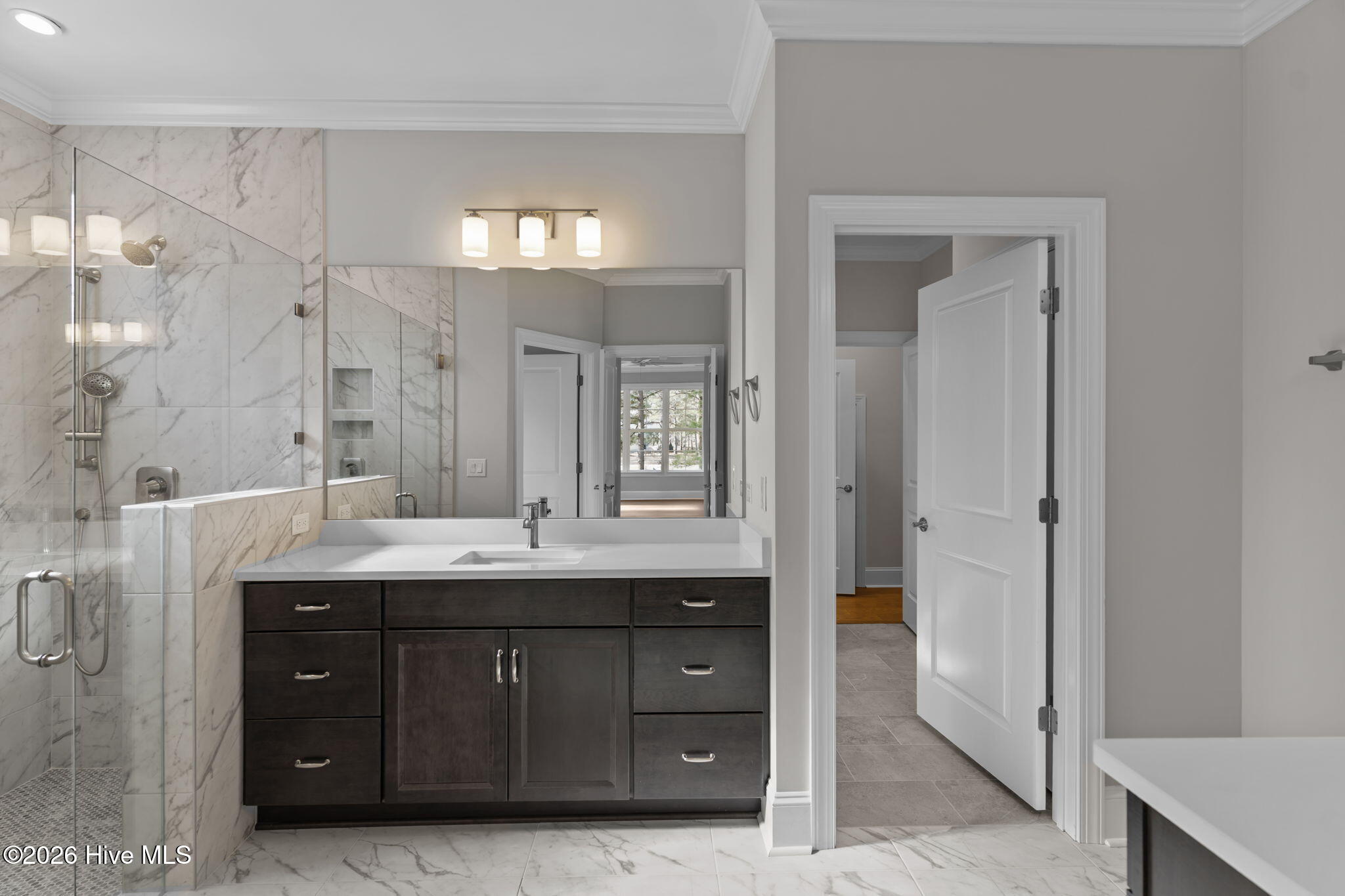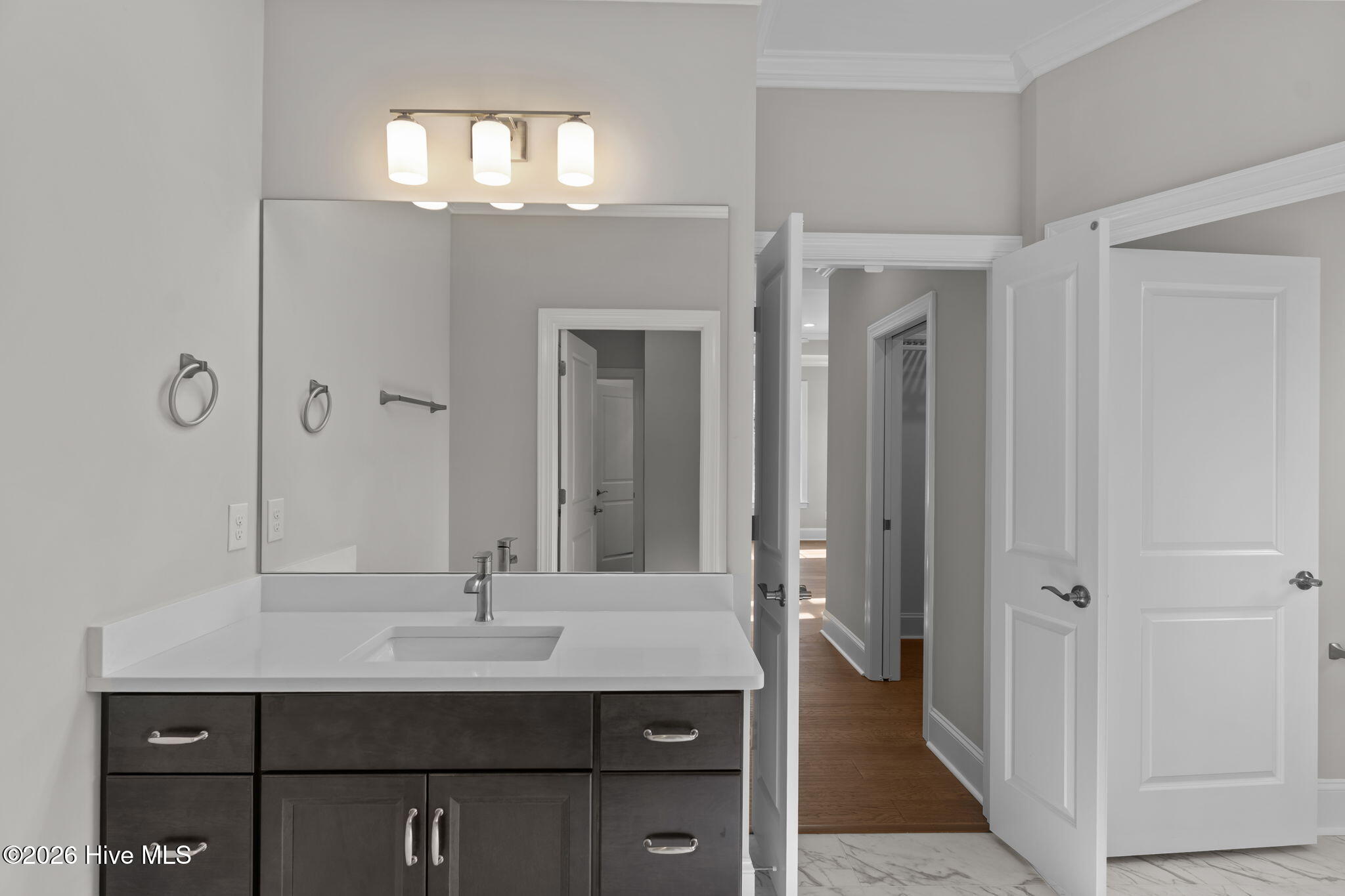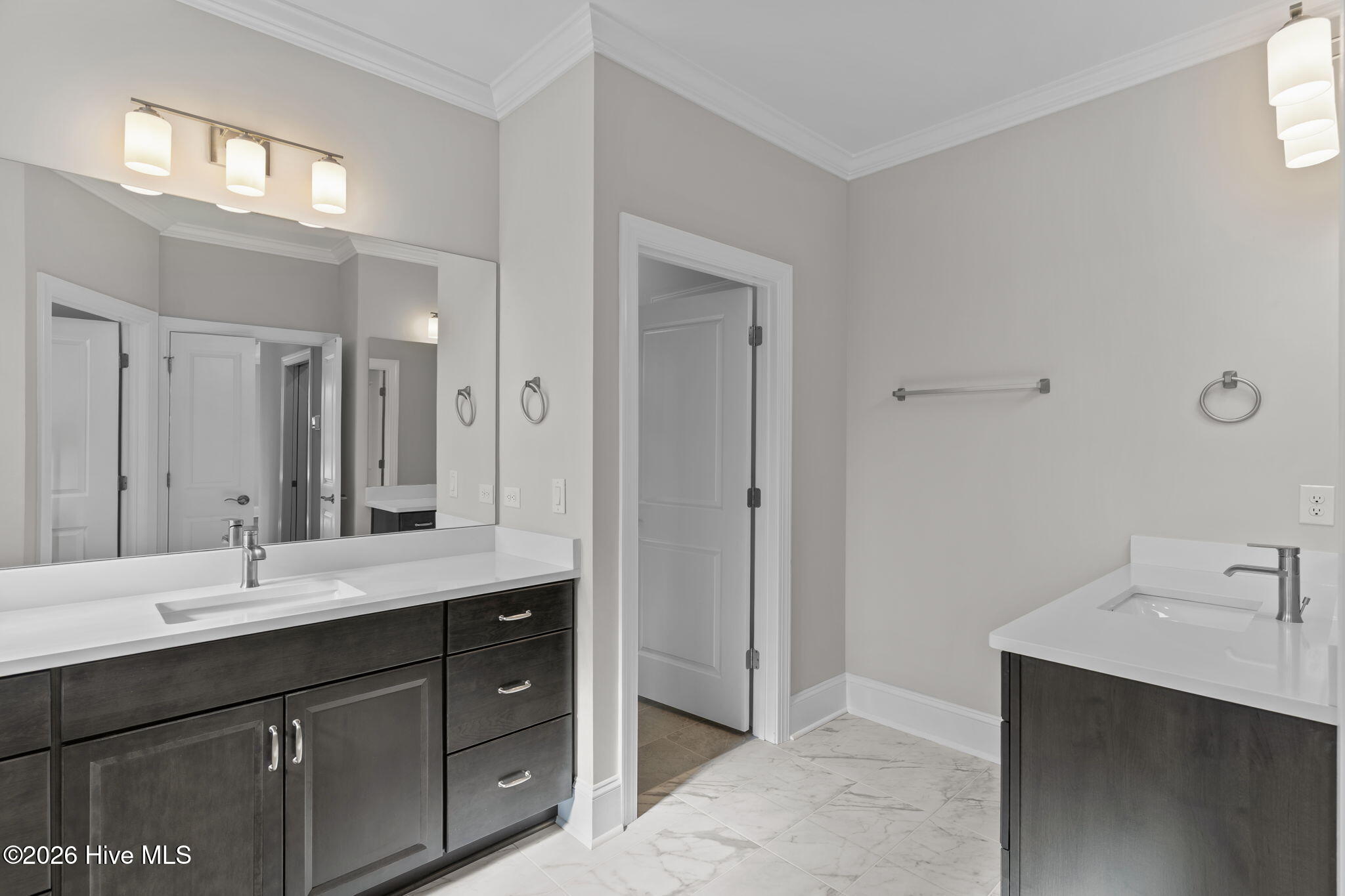 Settle into the ease of coastal living with this thoughtfully designed Coral Bay home by Award Winning Horizon Homes of Wilmington. Created with ''forever home'' living in mind, this 4 bedroom, 3.5 bath residence combines luxury finishes with comfort, accessibility, and low-maintenance convenience. Enjoy peace of mind with maintenance-free brick exterior and long-lasting 50-year shingles--so you can spend more time enjoying life and less time on upkeep. Inside, the open layout is both inviting and functional, centered around a beautifully appointed chef's kitchen complete with gas cooktop. There is abundant storage in the spacious walk-in pantry, and a large granite island perfect for casual dining or entertaining family and friends. The bright Carolina Room, with its wall of windows overlooking the golf course and ponds creates a relaxing space to unwind year-round. Split bedrooms & study all on first floor for easy first floor living. The first floor owner's suite is a private retreat, featuring separate walk-in-closets and its own climate control zone for personalized comfort. The beautiful owners bath has raised height vanities and zero entry tiled shower and access to the laundry area. 9' ceilings, fireplace, crown molding throughout, 7 -1/4'' baseboards, hardwood floors, are just a few of the upgraded features in the home. The Over-sized-finished garage is fully insulated with belt driven, Wifi, insulated garage door with added golf cart door. With emphasis on Smart Home, Energy Efficiency, our homes have radiant barrier roof decking, Low-E windows & doors, & 15 SEER Heating & Air Conditioning with Wifi Programable thermostats. Upstairs, a spacious guest suite with a full bath offers the perfect setup for visiting family or a quiet hobby space. This is more than a home--it's a comfortable, low-maintenance lifestyle designed to support you for years to come, all within one of the area's most desirable golf course community of River Landing. Near the coast of Eastern NC, River Landing is a vibrant community for those who are retired, starting a family, and everyone in between. Complete with world-class Club amenities, two 18-hole championship golf courses, a beautiful Clubhouse, glistening heated outdoor pool, expansive homesites, and scenic walking and biking trails there is something for everyone. Located just 25 minutes from Wilmington and an hour and 20 minutes from Raleigh, you can experience the charm and ease of a small hometown while being a short drive from North Carolina's most beautiful beaches and metropolitan areas. Leaseback opportunity available from builder.